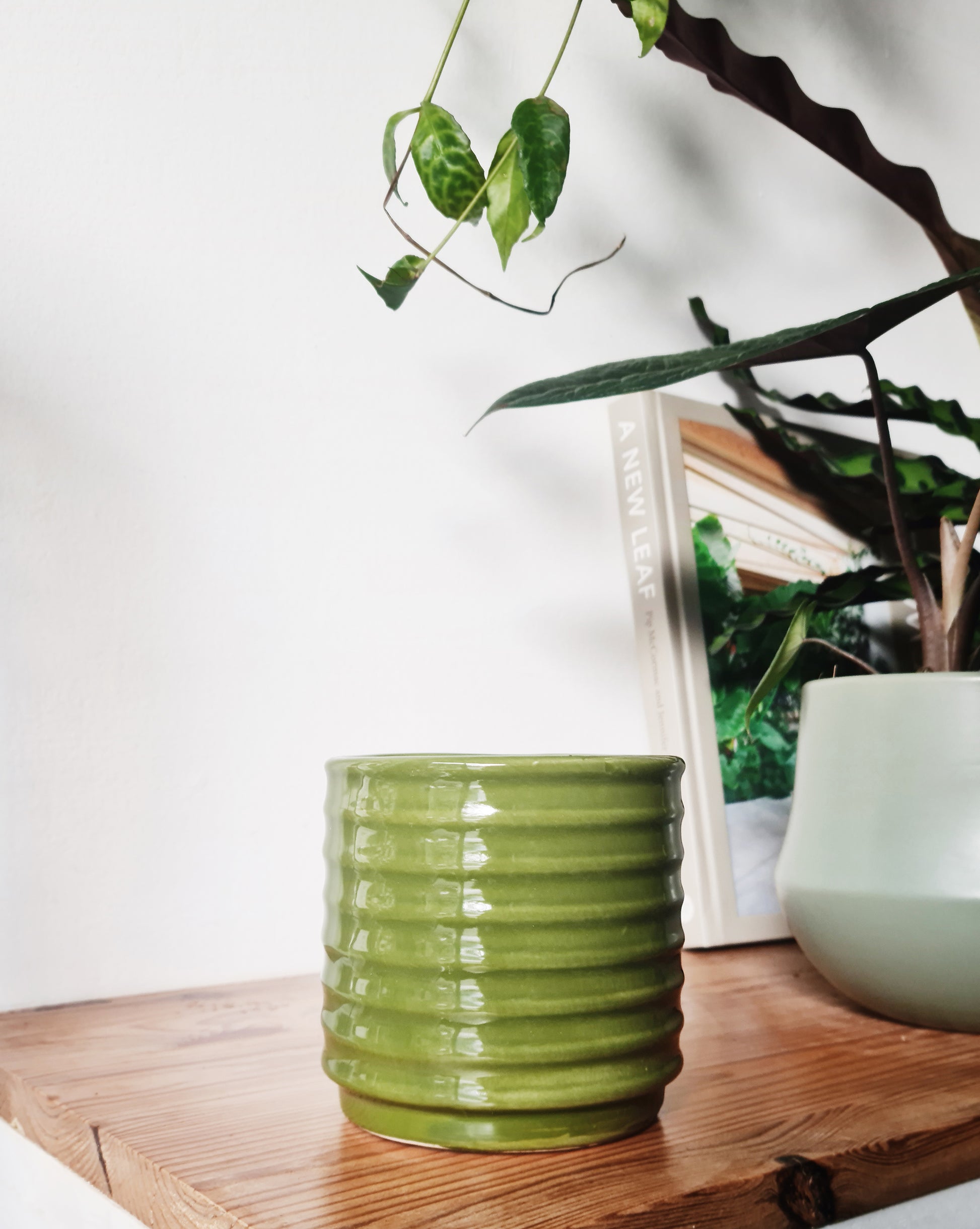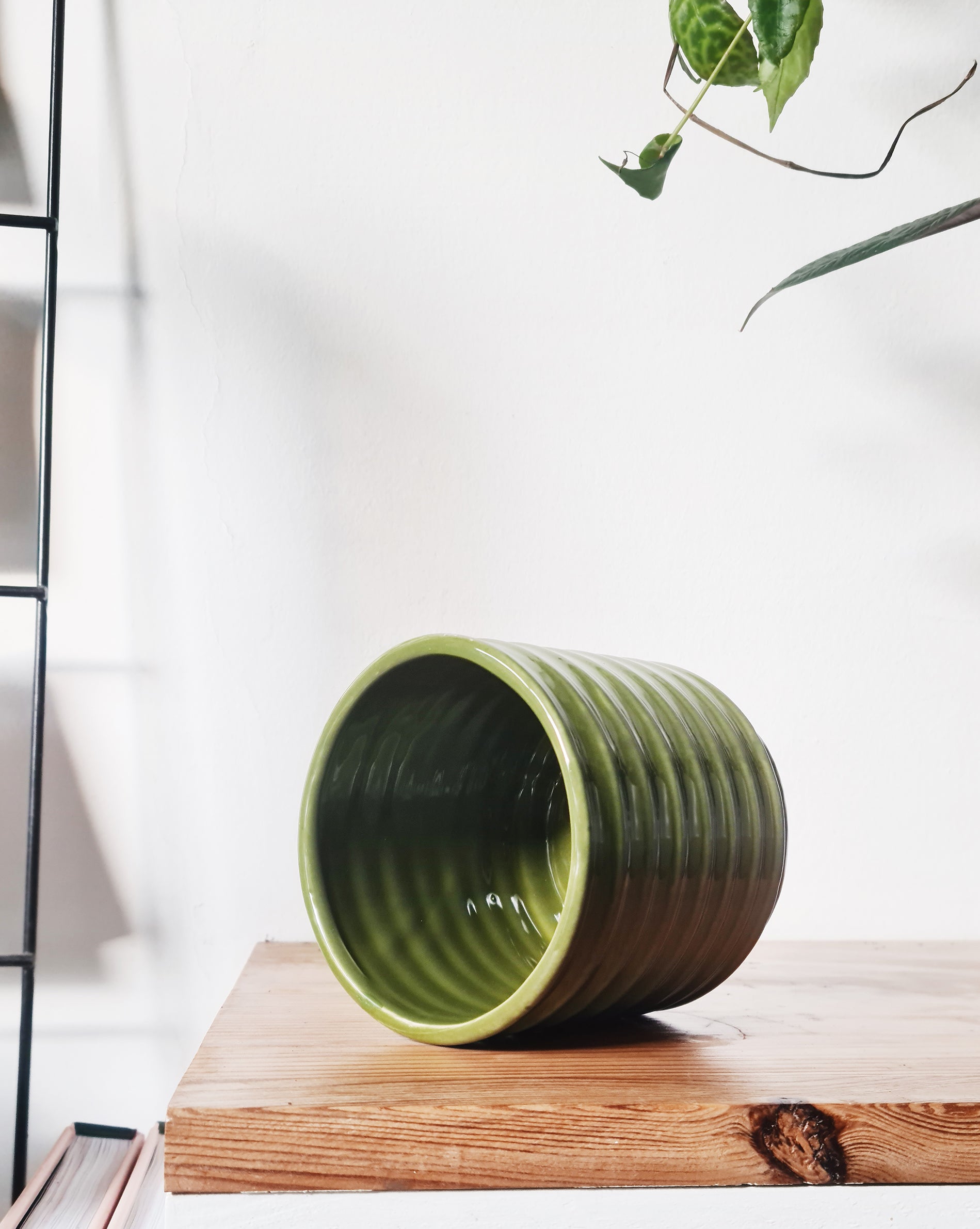 כלי קרמיקה ירוק בעל טקסטורה עדינה של טבעות, בגוון ירוק מבריק ועמוק שמוסיף נגיעה טבעית ואלגנטית לכל חלל.